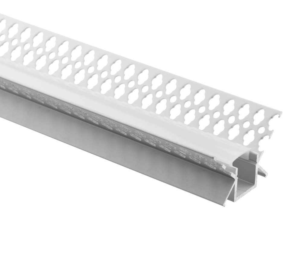 A plaster-in aluminium profile designed for 45° inward corner installation between plasterboard ceilings and walls. Its angled recessed structure allows for flush integration at junctions, producing clean, direct lines of light. Ideal for architectural applications in residential and commercial interiors where discreet, built-in illumination is desired.