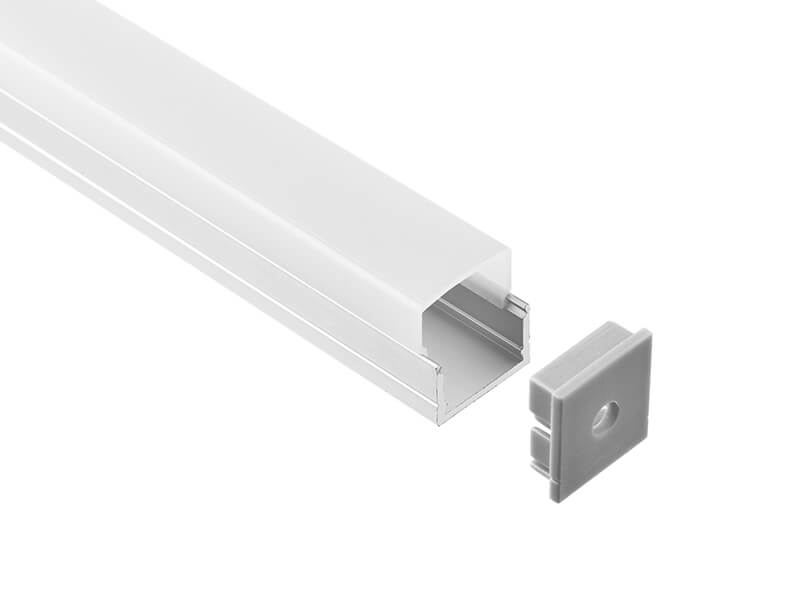 A compact surface-mounted profile with a squared diffuser that extends beyond the housing, delivering clean, uniform output. Designed for linear LED strips, it provides functional general lighting in under-cabinet, shelving, or architectural applications.